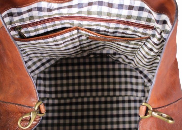 material | Vollnarbiges, pflanzlich gegerbtes italienisches Rindsleder mit Anilinlackierung am Griff. Poliester und Baumwolle Innenfutter. Alter Messingbeschlag |