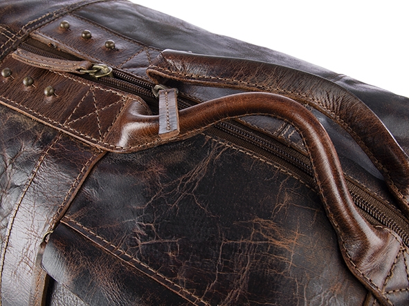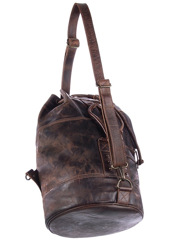 - mittels einer Lederlasche, die mit Druckknöpfen zwei Metallösen umschließt, kann der Seesack von oben zusätzlich gesichert werden