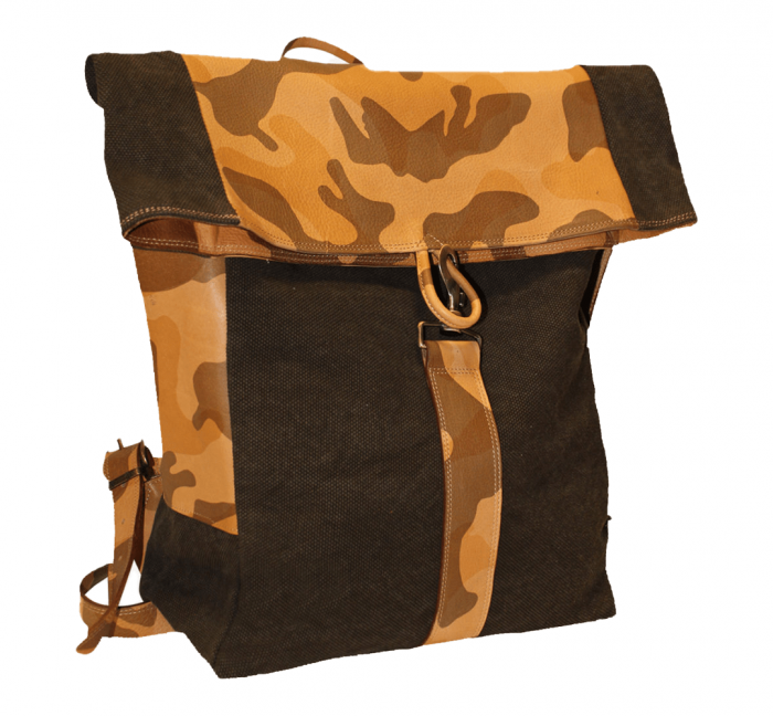 Einzigartiges Objekt seiner Art, düster, geladen und bereit für alle Eventualitäten. Praktischer Rucksack mit alten Linien, aber völlig modernisiert. Sofort erkennbar an seinem Metallverschluss, an seiner extravaganten Linie und an der geschwungenen Faltung des oberen Teils. Der Camouflage-Look erinnert an die alte und geheimnisvolle Kraft der Wüste.