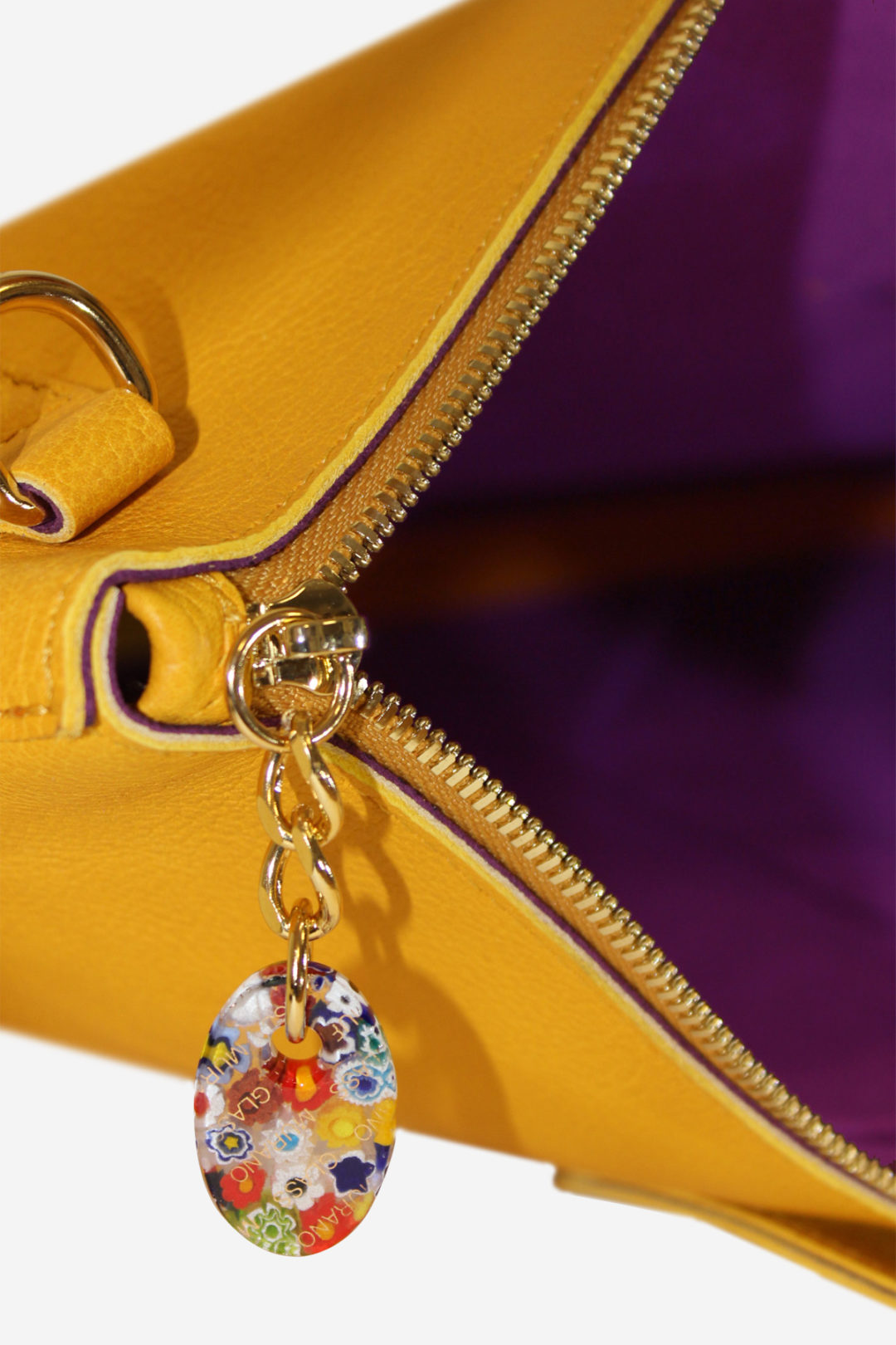 Schließlich veredelt und verbindet ein Artikel dieser Art italienisches Glashandwerk mit Lederwaren. Einerseits bereichert das Detail oder der Anhänger aus Muranoglas das Aussehen dieser Tasche. Andererseits verstärkt das pflanzlich gegerbte Leder, das sich weich anfühlt, die Qualitäten dieser Tasche.
